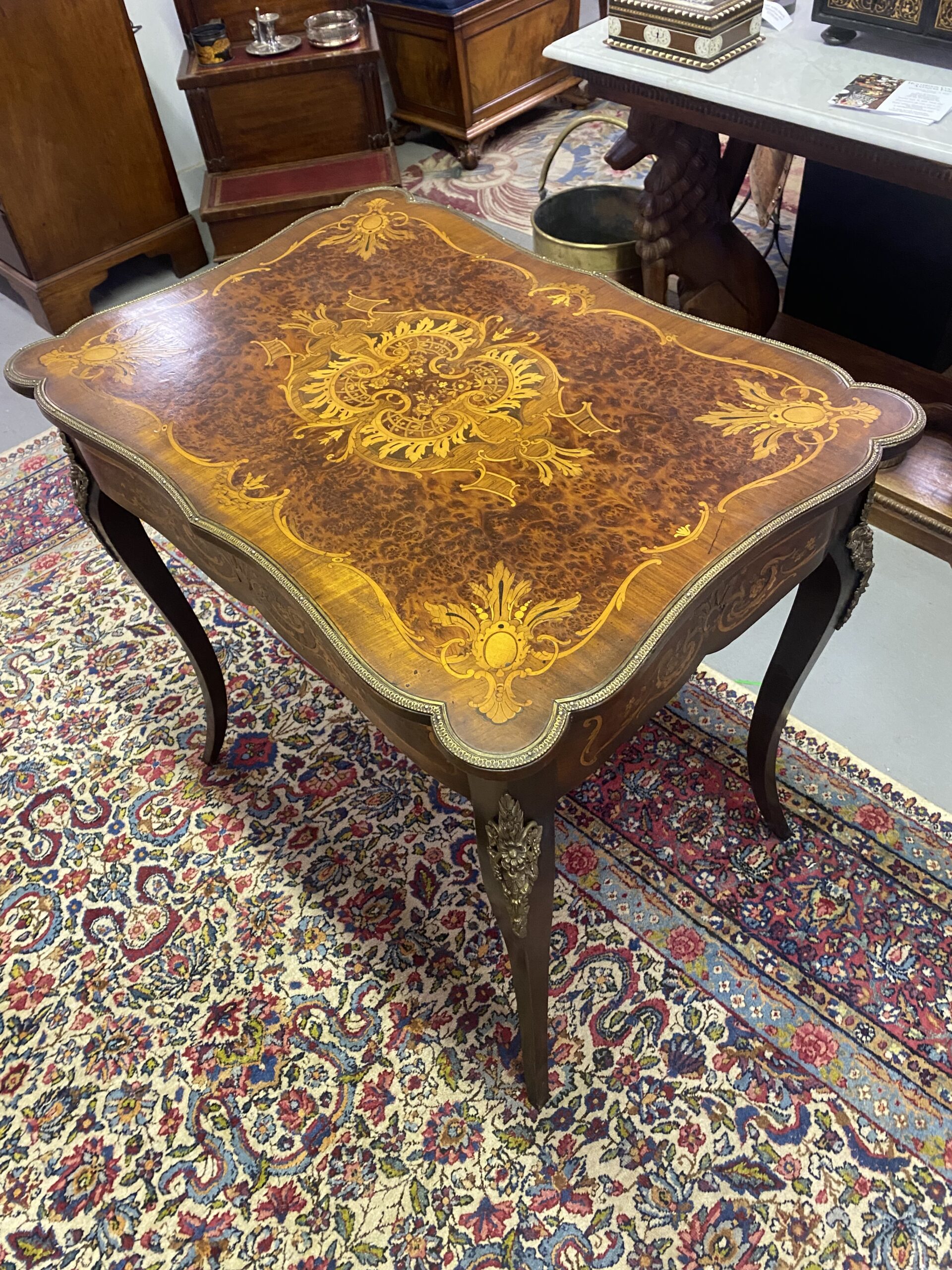 French 19thc walnut with brass and multi wood inlay table